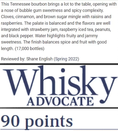 Whisky AdvocateI'm thrilled to announce, I just got my 1st print review, and Whisky Advocate just gave me a 90(Outstanding: a whisky of superior character and style)! The review reads: This Tennessee bourbon brings a lot to the table, opening with a nose of bubble...